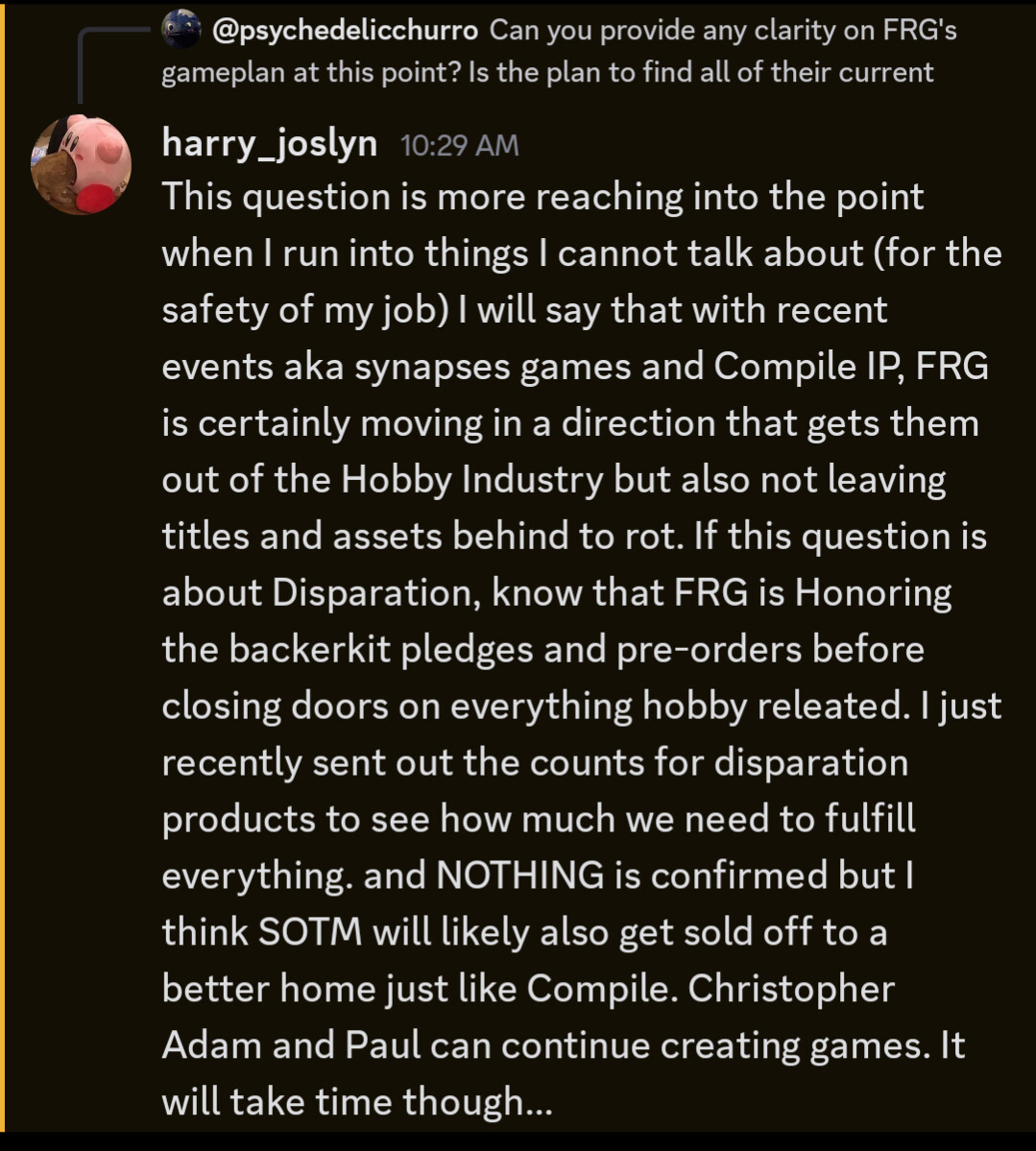 This screenshot was taken by @psychedelicchurro on a Compile discord from a FRG employee.